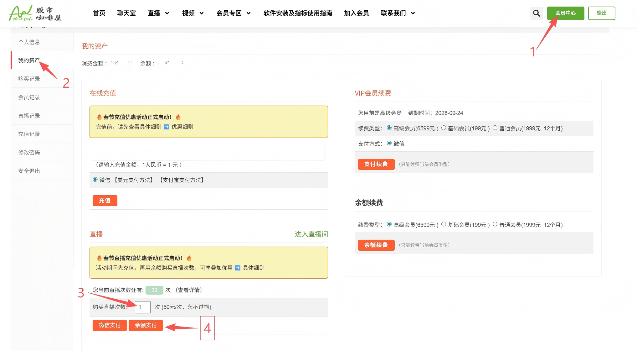 【会员中心】 ->【我的资产】 -> 【购买直播次数】