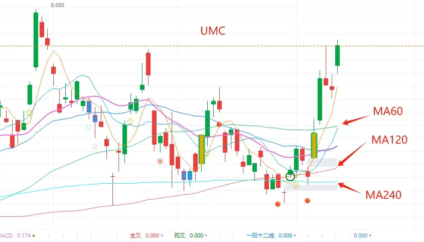 而反观UMC,MA60 MA120 MA240是多头排列,就说明60天的持股成本>120天的持股成本>240天的持股成本,股价一旦突破上去,这些好不容易解套的成本就可能不卖了,也就减少了抛压。